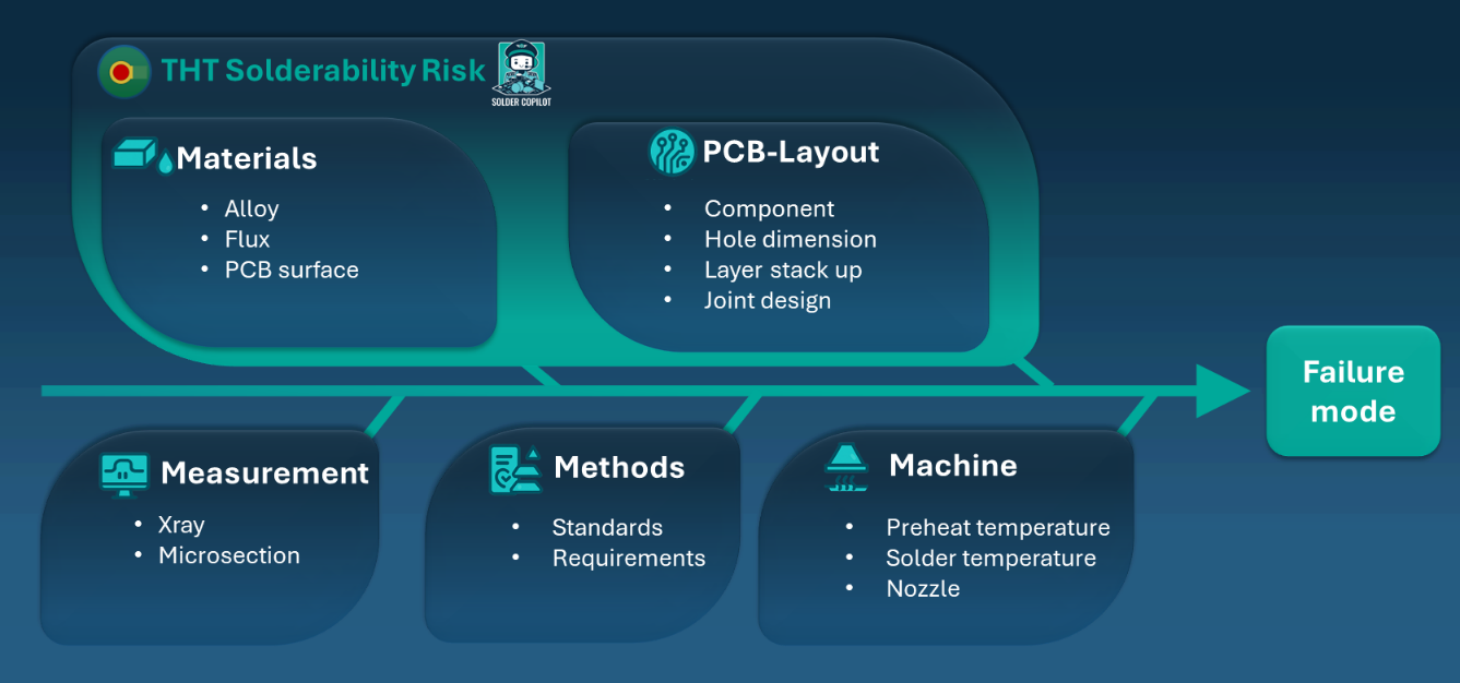 THT soldering failures often originate in PCB design decisions. This service provides a Solderability Risk Assessment that links layout and component geometry to thermal behaviour, hole fill, and copper dissolution—using Ishikawa cause–effect mapping supported by soldering simulation.